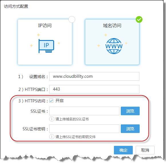 用户使用域名访问时,可以上传域名SSL证书,开启HTTPS访问。