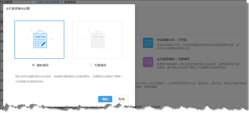 在关键设备运维策略中,新增主机登录事由设置,管理员可以强制要求每次会话创建时填写登录事由,便于团队所有成员了解每一次运维操作的原因和目的。