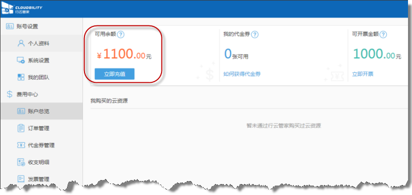1)增加用户余额:用户可以提前进行账户充值,账户余额可以用于行云管家团队升级续费、以及未来在行云管家中购买和续费云资源;