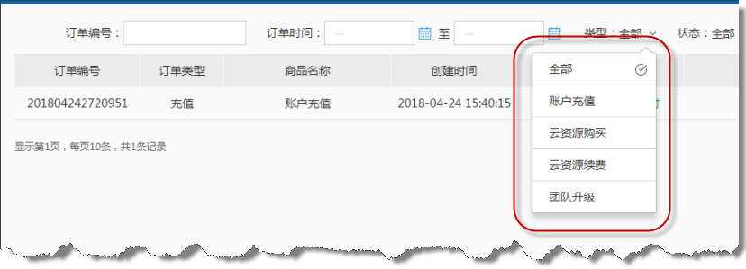 2)增加订单类型:除原有的团队升级订单外,新增云资源购买和续费类型的订单;