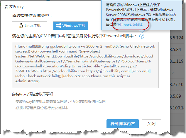 在Windows服务器上安装行云管家Proxy、内网访问助手和行云管家Agent时,以前版本仅支持powershell脚本,同时要求必须是2.0版本以上。对于一些类似Windows瘦客户机的用户来说,新增bat安装脚本能够弥补其无法安装powershell2.0的缺点。