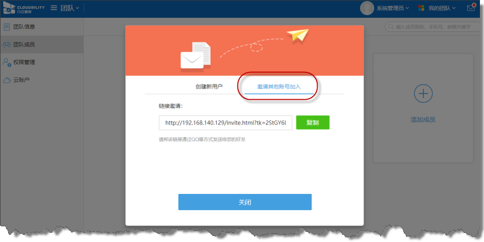 由于多团队的支持,一个账号可能存在于多个团队中,因此团队管理员在增加成员时,除可以直接创建新用户外,还可以邀请其他已创建的账号加入。
