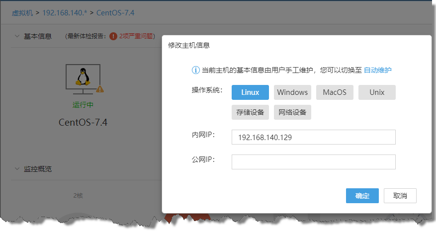 默认情况下,主机信息由系统自动维护,当主机的IP、操作系统发生变化时,系统能够将其自动同步。如果用户希望自行修改主机信息,可以将维护状态切换至手工维护,目前支持以下两类信息的自定义:
