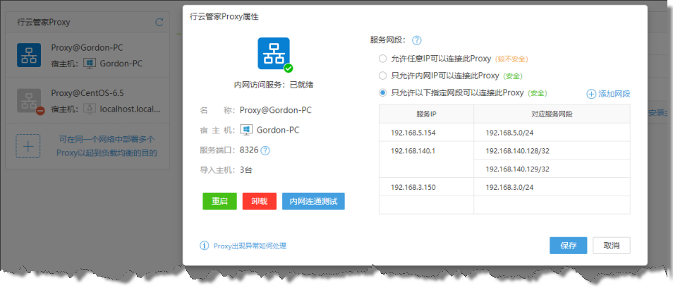 鉴于以上原因,行云管家在本版本提供了Proxy的服务IP和服务网段的概念,服务IP即Proxy所拥有的IP,服务网段指Proxy的服务IP对应的网段,Proxy在访问目标主机时,会根据服务网段来确定采用哪个服务IP来进行通信,当出现较复杂的网络环境时,通过用户手工指定服务网段,可以保证目标主机和Proxy处于一个网络质量最稳定的线路。