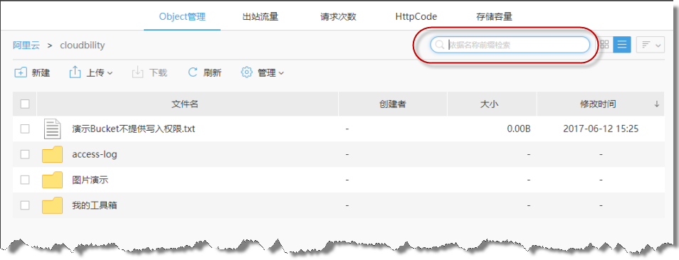 当Bucket中文件(Object)数量过多时,查找文件非常不方便,新增的文件搜索功能,可以方便用户在当前Bucket下定位文件。