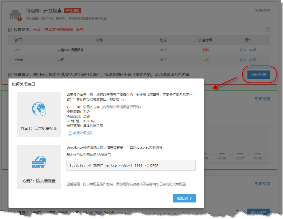 c)需要手工处理的体检项:例如防火墙设置、关键软件包修复等,这类问题的处理需要考虑服务器本身的情况,如果直接提供在线修复,可能会导致很严重的后果,因此,我们提供了修复指引,用户可参考指引说明进行手工修复;