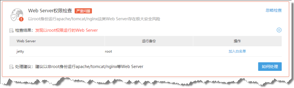 a)Web Server权限检查:以root身份运行apache/tomcat/nginx这类Web Server存在极大安全风险,考虑到安全因素,建议以非root身份运行apache/tomcat/nginx等Web Server;