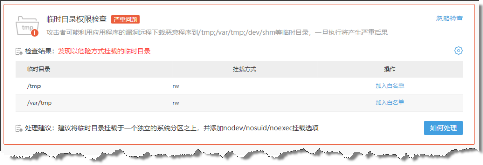 b)临时目录权限检查:攻击者可能利用应用程序的漏洞远程下载恶意程序到/tmp;/var/tmp;/dev/shm等临时目录,一旦执行将产生严重后果,建议将临时目录挂载于一个独立的系统分区之上,并添加nodev/nosuid/noexec挂载选项。