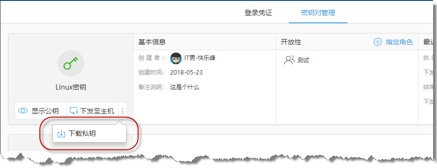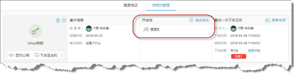 将SSH密钥对下发到主机后,只要能使用该密钥对,便可以轻易的以密钥下发时指定的账户身份登录主机。因此,为了确保主机的安全,SSH密钥对的使用也需要进行授权管理,只允许SSH密钥对指定的角色才可以在行云管家中使用该密钥对登录主机。