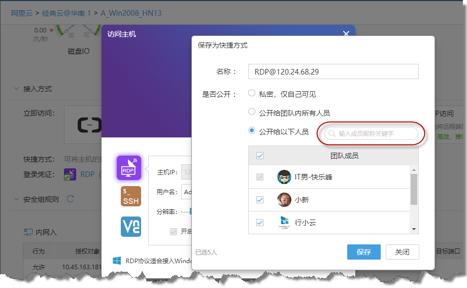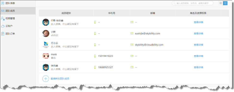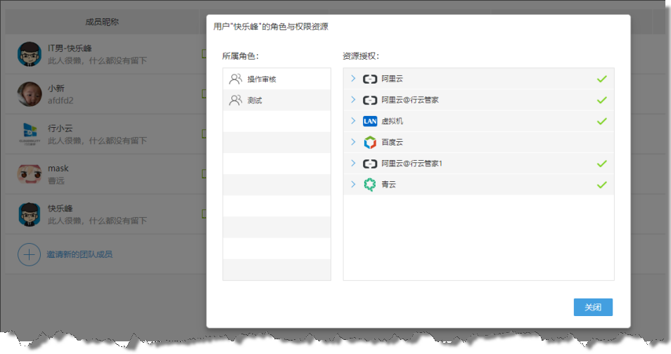 b)查看某个成员拥有的角色及资源权限设置:在行云管家中,一个成员可拥有多个角色,因此,团队管理者难于知晓某个成员拥有哪些角色和拥有哪些资源权限,在本次优化中,管理者可通过查看成员详细信息,了解某个成员的全部授权信息;