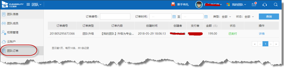 可以在此处直接查看当前团队相关的所有订单,任何团队成员所创建的团队升级订单,都将在此处展示,而不再需要去从每位成员的费用中心去查找,方便管理员了解团队的历史消费情况。