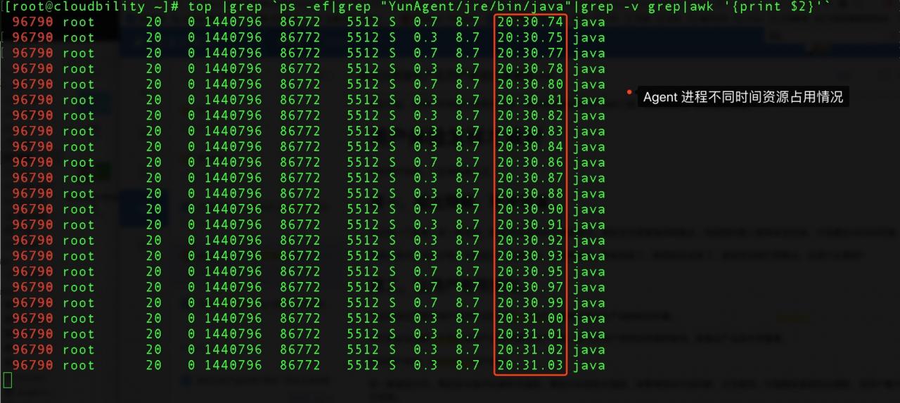 [root@cloudbility ~]# top |grep `ps -ef|grep "YunAgent/jre/bin/java"|grep -v grep|awk '{print $2}'`