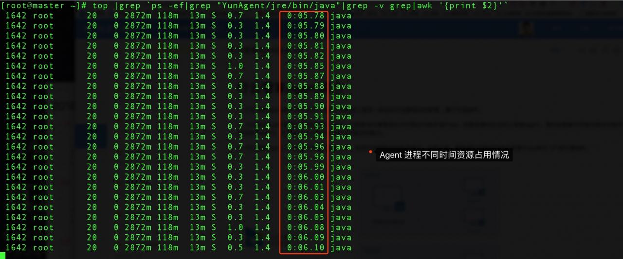 [root@master ~]# top |grep ps -ef|grep "YunAgent/jre/bin/java"|grep -v grep|awk '{print $2}'
