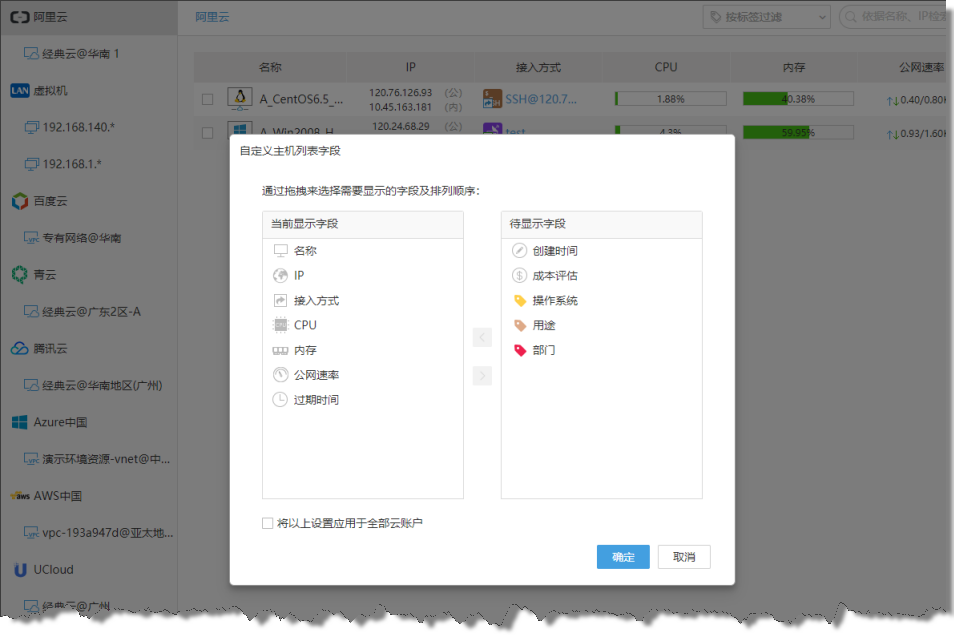 新增对主机列表展示字段的自定义,用户可根据自己的业务情况,以云账户为维度,自定义主机列表展示的字段,目前支持基础信息、监控信息、主机标签三类字段。