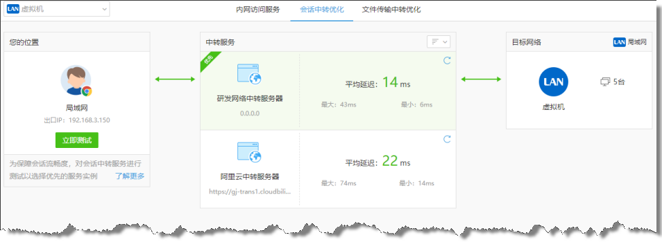 在行云管家中打开的每一个会话(Windows远程桌面、Linux远程终端等)本质上都是通过“会话中转服务”建立的连接。因此,用户和会话中转服务以及主机与会话中转服务之间的网络质量将成为会话流畅度的关键因素,行云管家在全国范围内部署了多套会话中转服务实例,我们会通过智能算法为您名下的每一个主机网络选择最优的会话中转服务。但受限于网络质量的变数很大,我们的智能算法未必是最优的网络链路,此时,用户可以通过“中转服务网络测试”获取测试数据,并依据于测试结果设置最优的会话中转服务。