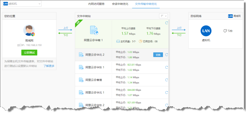 我们会通过智能算法设置最优的主机网盘存储位置,用户也可以通过“文件传输中转服务测试”获取测试数据,并依据于测试结果设置最优的文件中转站。