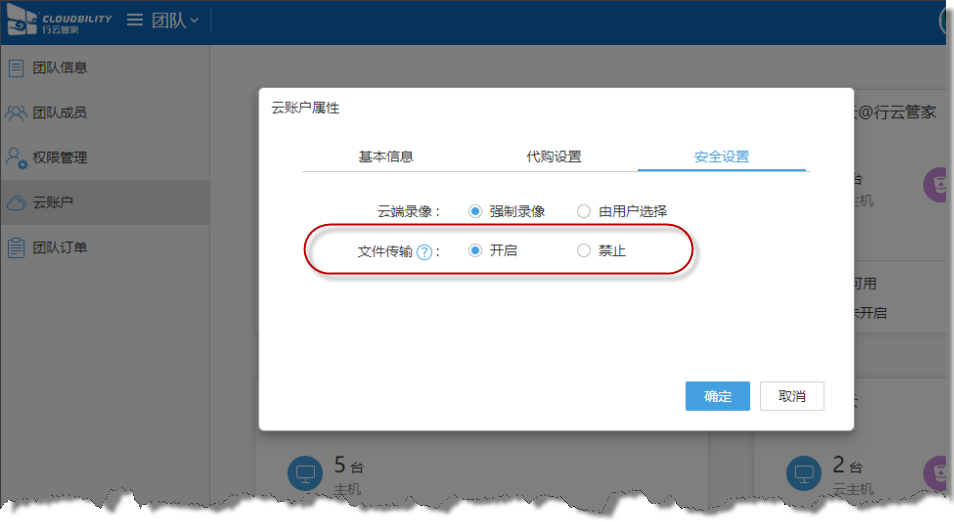 a)云账户文件传输设置:在云账户属性的“安全设置”中,新增“文件传输”设置,该设置将限制当前云账户下的主机,默认是否开启文件传输;
