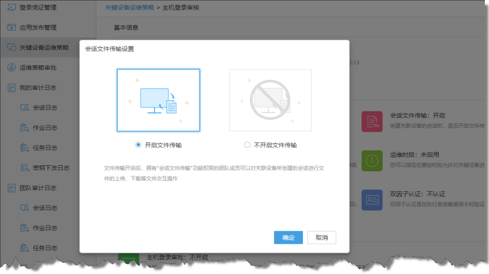 b)运维策略文件传输设置:在关键设备运维策略中,新增文件传输设置,只有开启了文件传输,该策略关联的主机才被运维进行文件传输,需要注意的是:对于一台主机而言,运维策略的文件传输设置,优先级高于云账户文件传输设置;