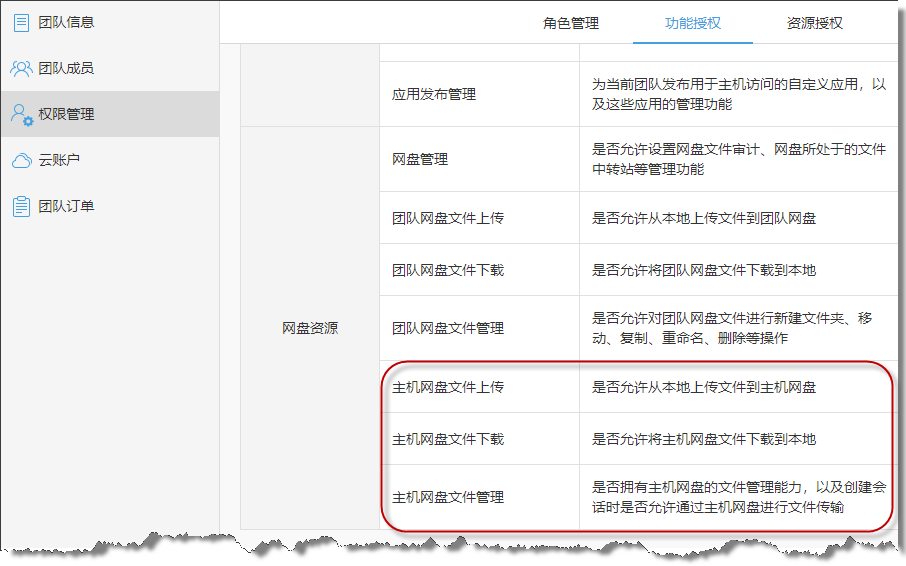 c)主机网盘管理权限:在功能权限中,新增了“主机网盘文件上传”、“主机网盘文件下载”、“主机网盘文件管理”三项功能权限,分别对应在主机网盘和会话中的文件上传、下载和管理功能。