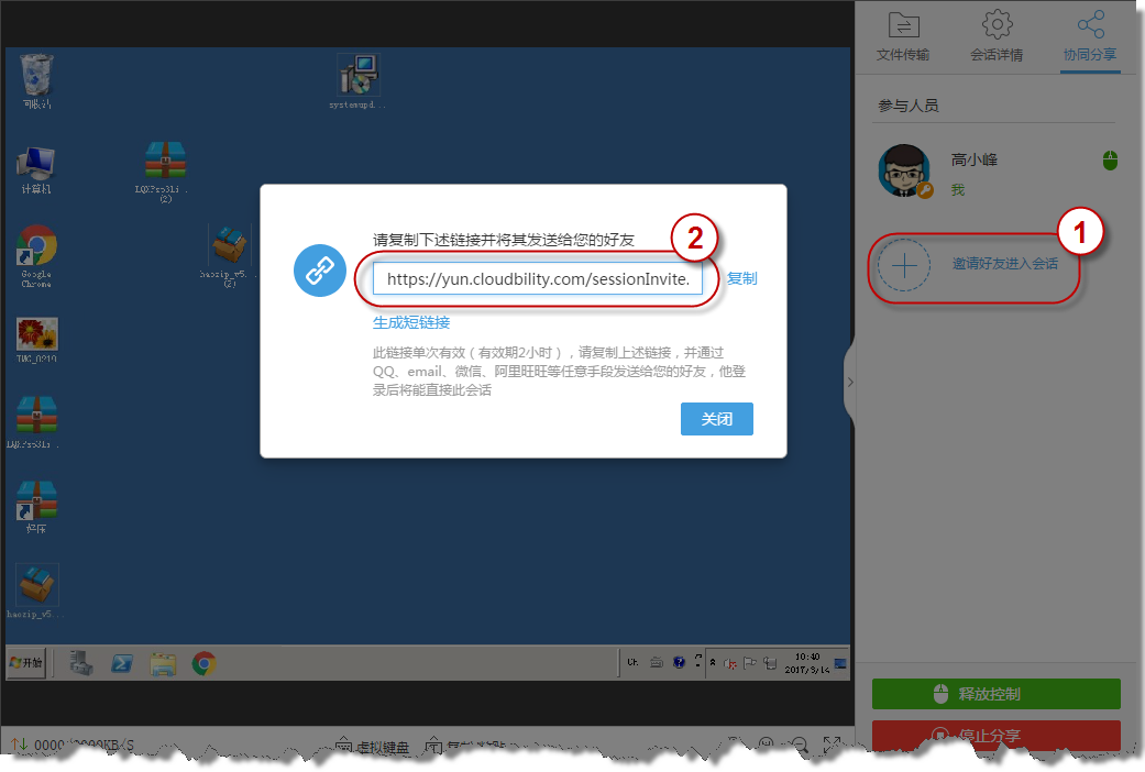 也就是说,行云管家的功能非常强大,在这里,任何会话都是可以分享的。打开行云管家的协同分享功能之后,直接点击“邀请好友进入会话”按钮,将会获得一个有效期2小时的分享链接,复制链接之后通过QQ、email、微信、阿里旺旺等任意社交工具发送给被邀请人,即远程协同方,他打开链接即可登录立即使用。操作流程简洁方便,无需太多繁琐步骤。