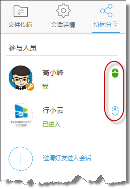 当然,你可能要问,我如何得知在远程协作过程当中,正在执行远程操作的人是谁?很简单,行云管家为此专门设立了明确的标识。在类似QQ好友列表一样的参与人员列表中,依据“小鼠标”来判断当前控制权的状态,实心鼠标则表示该用户已经获取控制权。相反,空心鼠标表示该用户只是参与观察,并未获得控制权。当需要切换控制权时,创建者只需要点击“小鼠标”进行切换即可。