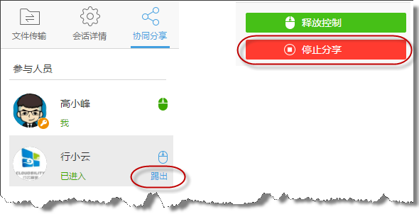 最后,在协同分享完成后,问题得以解决,使用者可以选择将协同方“踢出”会话,并将会话分享状态关闭,这样对方都会从当前会话中离开,远程协作到此结束。