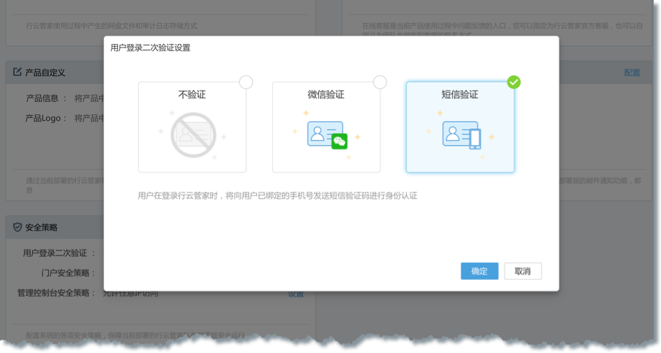 为了增强私有部署版本中门户登录与管理控制台登录的安全性,防止盗用账号、暴力破解等影响系统安全情况的发生,我们在管理控制台的基本配置中新增了安全策略设置模块,包括:a)用户登录二次验证:在配置了微信公众号或短信网关的前提下,可以在管理控制台中设置用户使用微信或短信的登录二次验证,以验证是否为本人登录,保证登录安全。