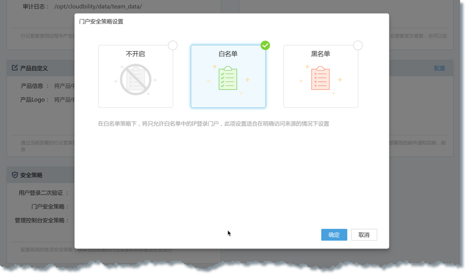 b)门户安全策略:可以设定白名单或黑名单策略。 白名单:将只允许白名单中的IP登录门户,适用于明确访问来源的场景;
