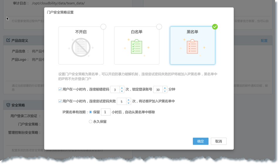 黑名单:黑名单中的IP将被禁止登录门户,同时可以设置方暴力破解策略,锁定多次尝试密码失败的登录账号或IP;尝试次数、锁定时间均由用户自定义配置。