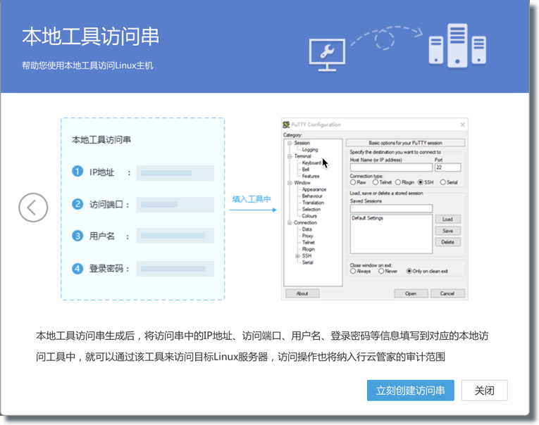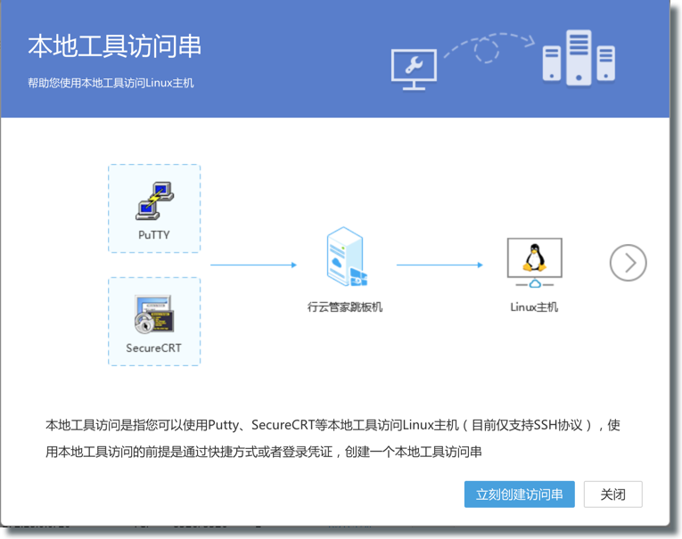 为了方便用户能通过Putty、SecureCRT等本地访问工具远程访问目标服务器,并能使用行云管家的审计功能,我们支持了SSH跳板机:a)为了实现本地访问工具远程访问的审计,需要先通过快捷方式或登录凭证创建一个本地访问工具串。