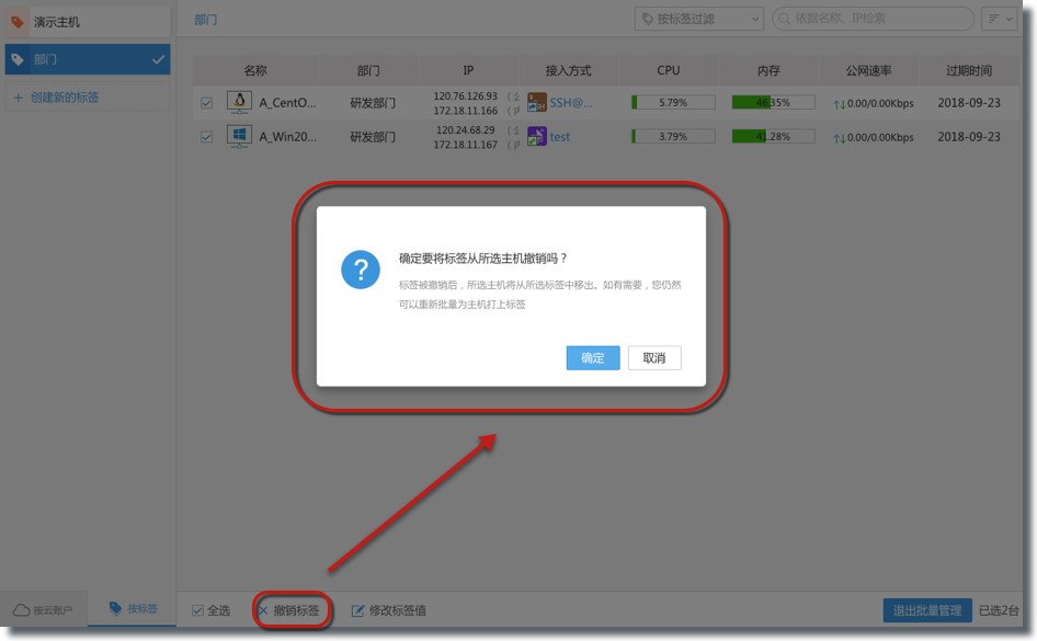 为了提升用户使用主机标签的体验,方便用户更方便的使用主机标签以适应自身运维业务,我们在新的版本中针对这一功能做出了优化,包括:a)增加批量撤销标签:用户可以针对某个标签下的主机进行批量撤销标签。