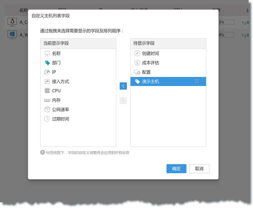 b)标签视图增加自定义主机列表字段:用户可根据自己的业务情况,以标签为维度,自定义主机列表展示的字段。