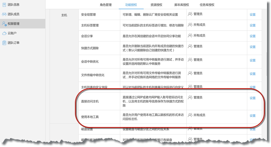 同时我们在作业中心的默认脚本库中,为用户预置一个修改Linux操作系统密码的脚本,用户可以直接使用该脚本来修改主机密码。新增直接访问主机与SSH跳板机访问主机的权限:为了提高访问主机的安全性,我们新增“直接访问主机”与“SSH跳板机访问主机”的功能权限,没有权限的用户将不能以任何方式通过行云管家平台来访问目标服务器。“直接访问主机”功能权限:该权限用于控制团队成员是否能够在行云管家中直接输入主机的IP、主机账号、自主创建快捷方式等手段来直接访问某台主机;“SSH跳板机访问主机”功能权限:该权限用于控制团队成员是否具备使用本地SSH工具来访问主机的能力;