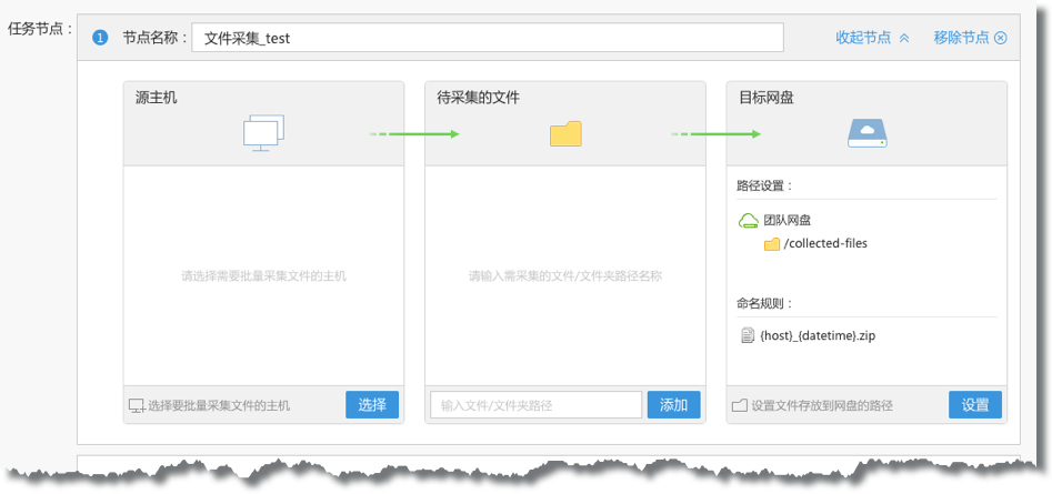 在作业中心,很早就支持文件采集功能,但这一特性在任务编排中一直缺失。本版本我们在执行命令、执行脚本、分发文件的基础上支持了文件采集。使任务编排的节点类型保持与作业中心同步。