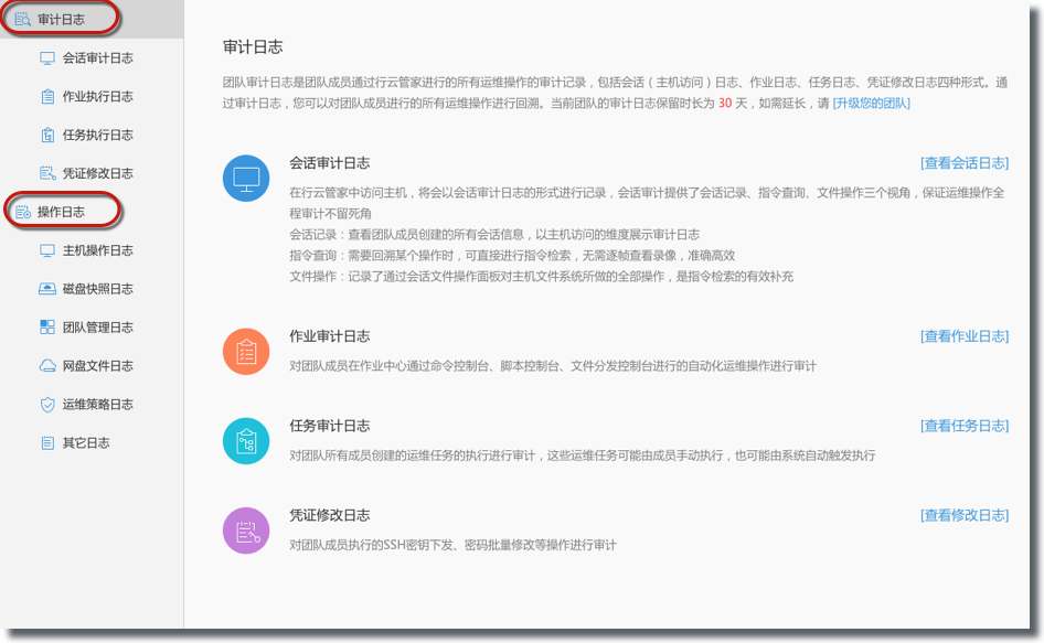 为保证用户能更清晰的查看团队的运维日志,我们对行云管家中的所有日志进行了优化:a)将审计日志从安全审计模块中剥离,并与操作日志进行合并,形成运维日志。