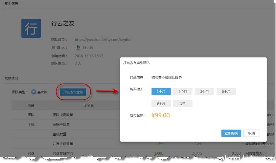 您可以在团队设置中,直接将团队升级为“专业版”,也可以通过阿里云市场等第三方平台购买我们的“专业版团队”服务。