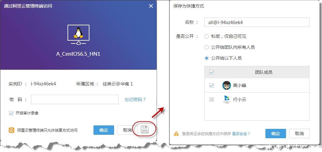 支持将阿里云管理终端访问凭证保存为快捷方式,并授权给相应的团队成员。同时,取消“使用云厂商管理终端”权限项授权和阿里云管理终端的密码自动补全功能,将管理终端的权限授权变为资源授权。