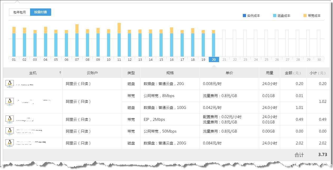2、方便的查看每天后付费产品产生多少消费,让用户告别云厂商流水账式的消费明细,一目了然的知晓每天消费情况。