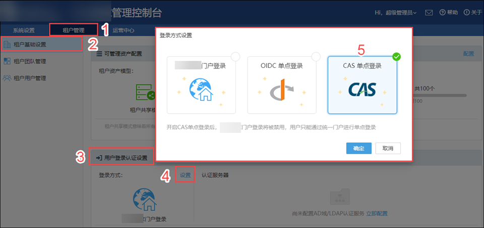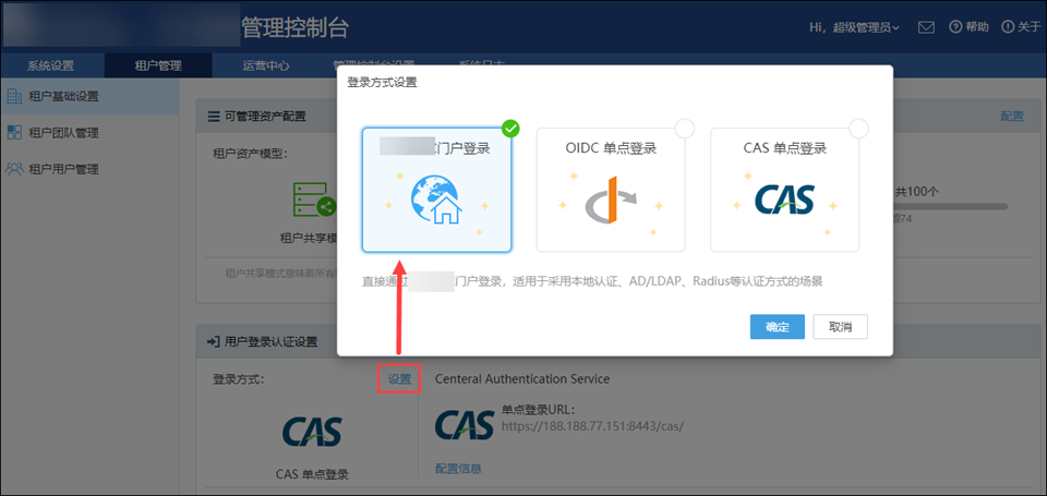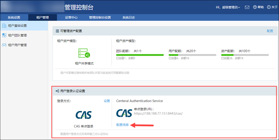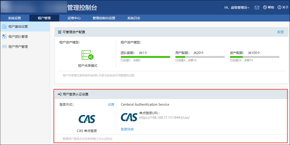 点击“租户管理”菜单下的“租户基础设置”,在“用户登录认证设置”里的“登录方式”这里可以选择“CAS单点登录”;