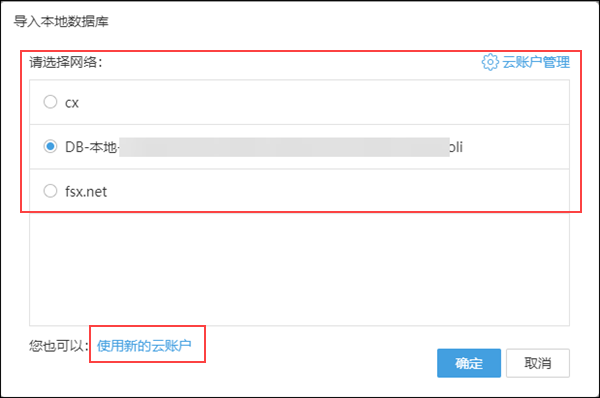 (1)如果您选择的是导入本地数据库,并且您所要导入的数据库不在如图已有的云账户中,请选择“使用新的云账户”。如果您要导入的数据库在图中的其中一个云账户里,请直接选择该云账户网络。这里以“使用新的云账户”为例;