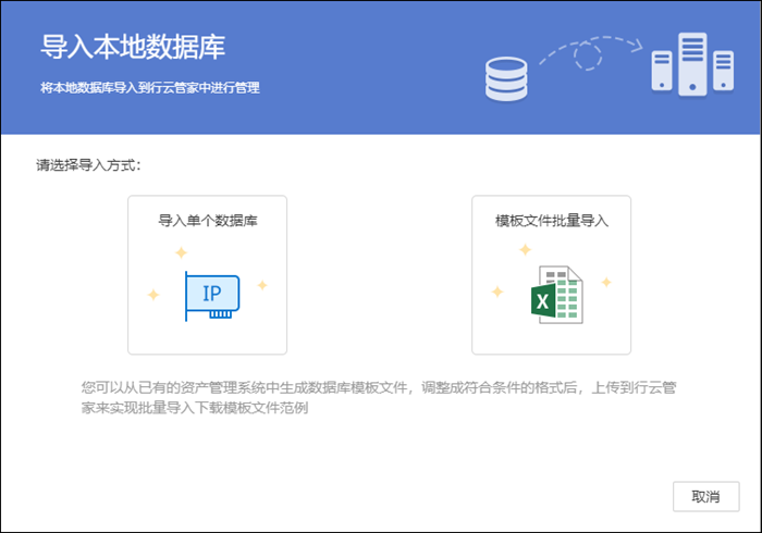 在这里可以选择导入方式,可以通过“导入单个数据库”以及“模板文件批量导入”这两方式进行导入,这里以“导入单个数据库”为例;