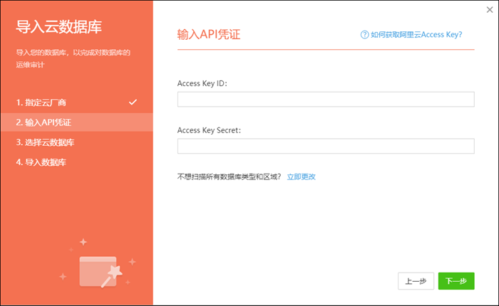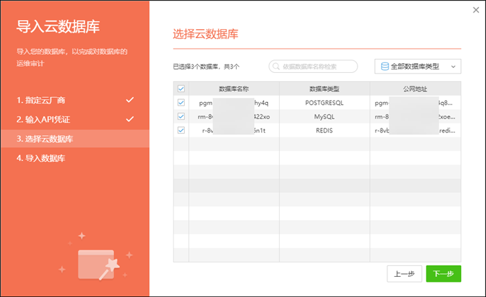 在“数据库管理”页面,点击“导入数据库”,在这里可以选择导入云数据库,也就是通过云厂商提供的AK方式进行对接来导入云数据库: