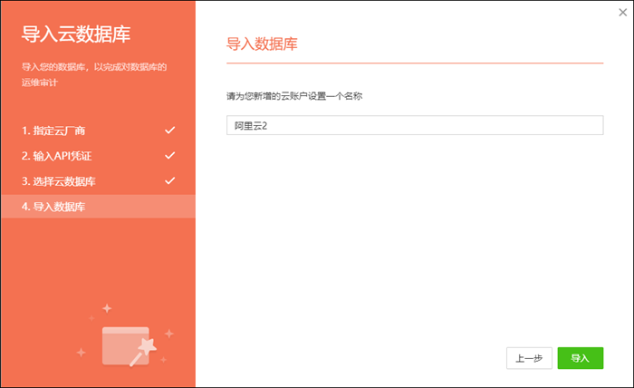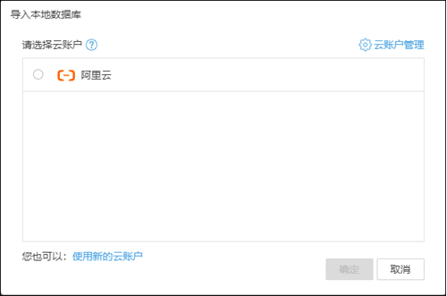 (1)如果您选择的是导入云数据库,并且您所要导入的云数据库不在已有的云账户中,请选择“使用新的云账户”;