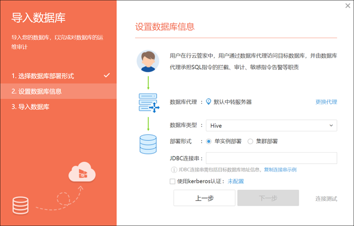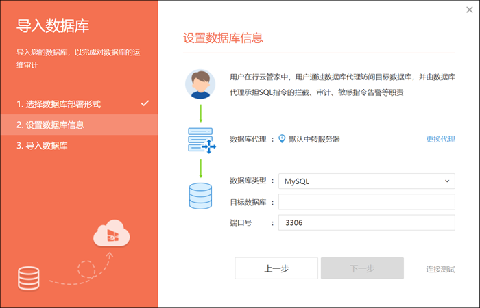 用户在行云管家中,通过数据库代理访问目标数据库,并由数据库代理承担SQL指令的拦截、审计、敏感指令告警等职责,在这里需要选择“数据库代理”;