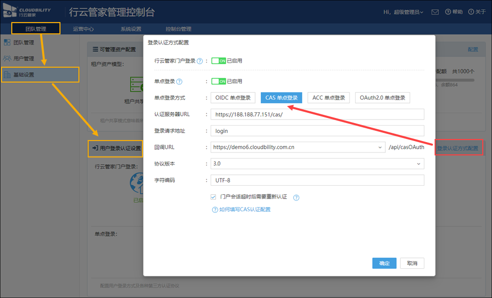 找到“团队管理”->“基础设置”->“用户登录认证设置”,点击“登录认证方式配置”,启用“单点登录”并选择“CAS单点登录”;