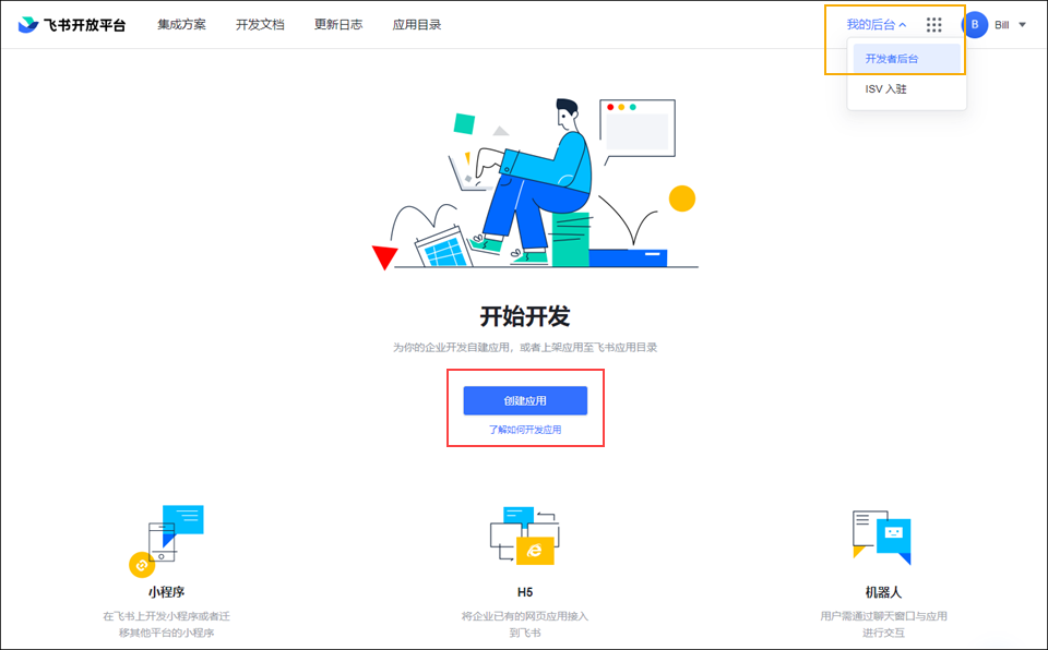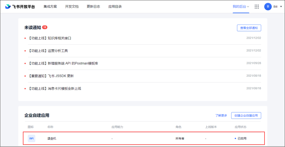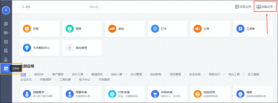 (1)登录飞书后点击“工作台”,点击“创建应用”后可以进入飞书的管理后台“飞书开放平台”;