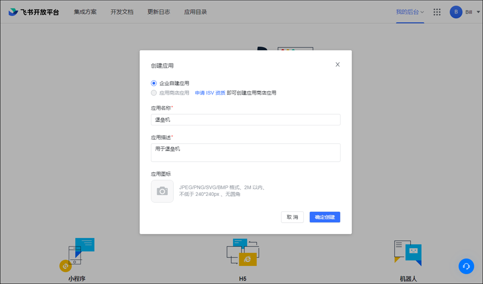 (3)选择“企业自建应用”,填写“应用名称”及“应用描述”后点击“确定创建”;