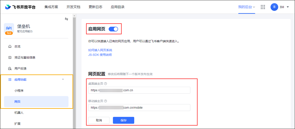 (5)在“应用功能”的“网络”模块中点击“启用网页”,并填写“桌面端主页”以及“移动端主页”;