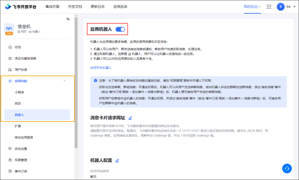 (6)在“应用功能”的“网络”模块中点击“启用机器人”;
