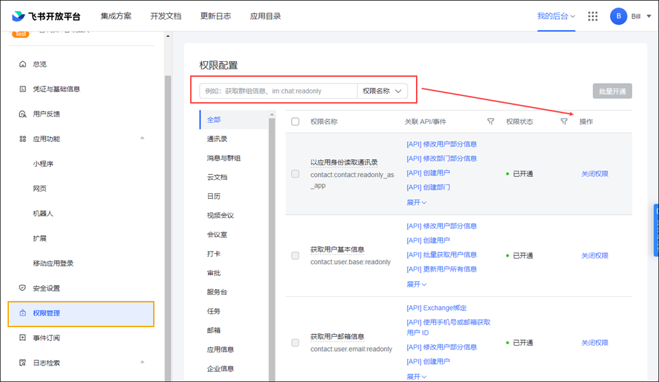(7)进入“权限管理”页面中,搜索并开通这些权限:“获取用户邮箱信息”、“获取用户 user ID”、“获取用户基本信息”、“获取企业信息”、“以应用的身份发消息”、“以应用的身份读取通讯录”;